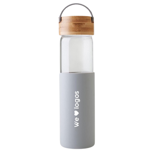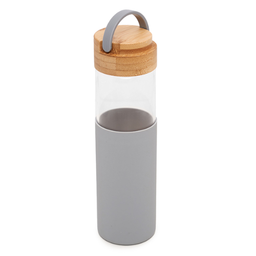 - Botella reutilizable de vidrio, con tapa de bamboo y funda de silicona.